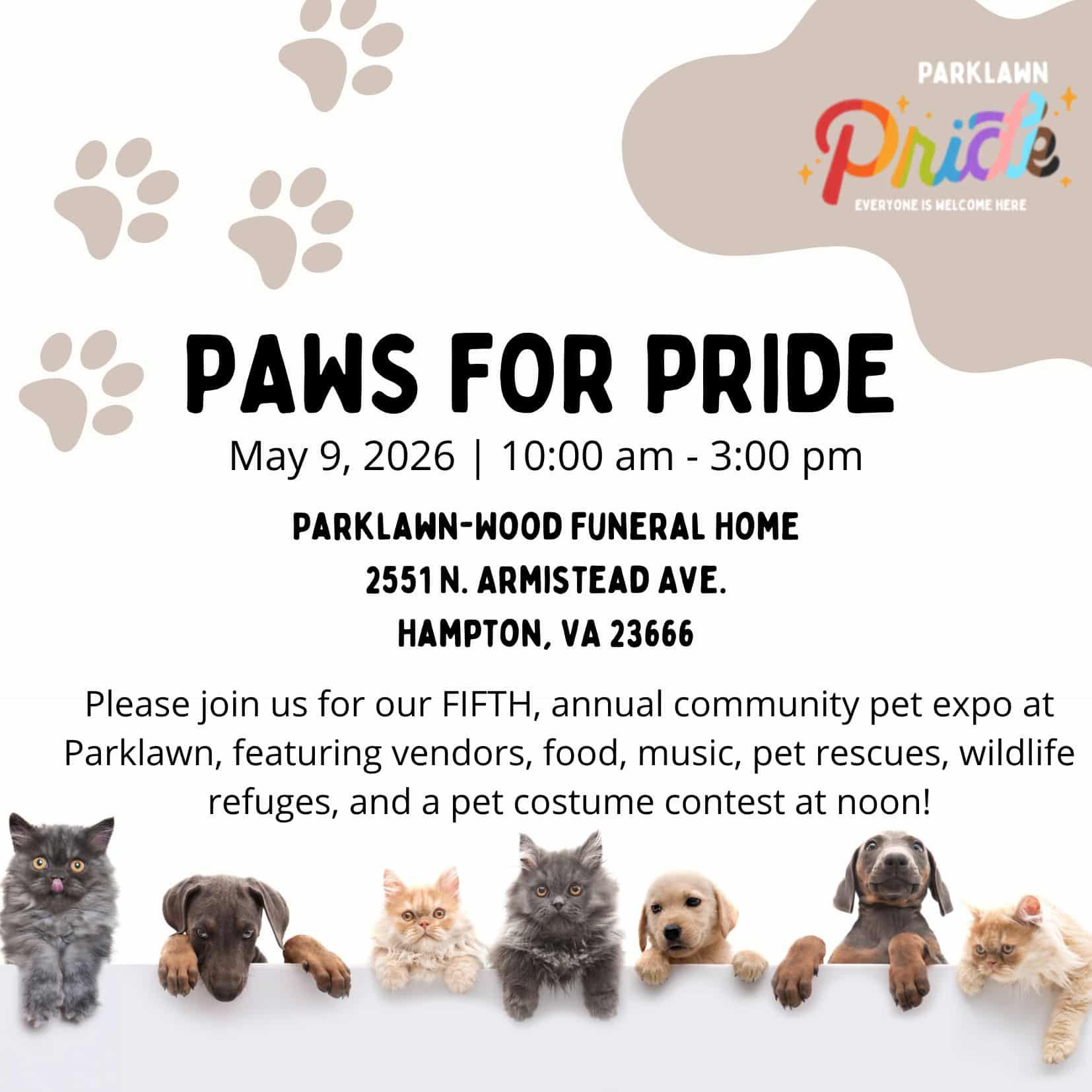 Come out to our 5th annual pet expo here at Parklawn! We will have pet and wildlife rescues, vendors, food trucks, and our favorite DJ Digital DJ's of Hampton Roads!